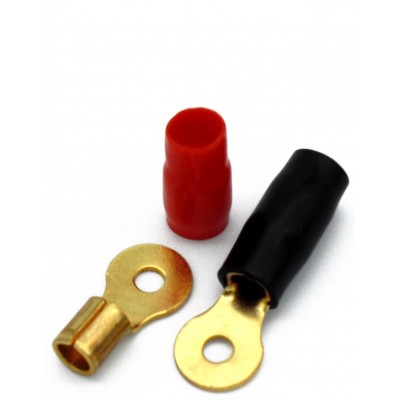 Connector Type: Ring | Wire Gauge: 8 AWG Terminal / Stud Size: #8 | Terminal Cover Colours: Red & Black | High Quality, Gold Finish *Sold as pair*