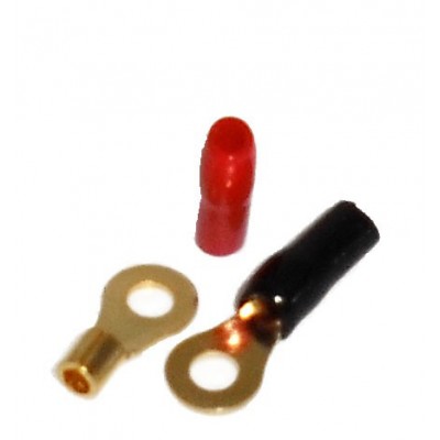Connector Type: Ring | Wire Gauge: 16 AWG Terminal / Stud Size: #8 | Terminal Cover Colours: Red & Black | High Quality, Gold Finish *Sold as pair*