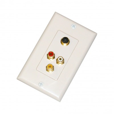 1 S-Video Female + Audio Video, 3 RCA Female wall plate, RCA plugs Color: White | Red | Yellow, Decora Style Plate, Screw set included, Color: White